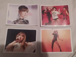Conjunto de cuatro cartones con imágenes de Taylor Swift. - Incluye cuatro fotos diferentes de la artista. - Ideal para coleccionistas y fans.
