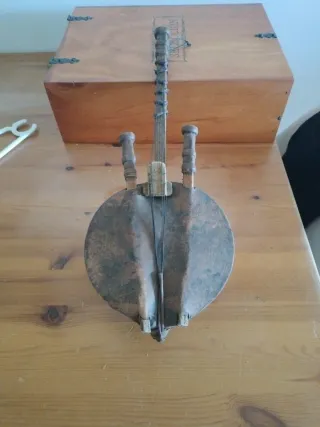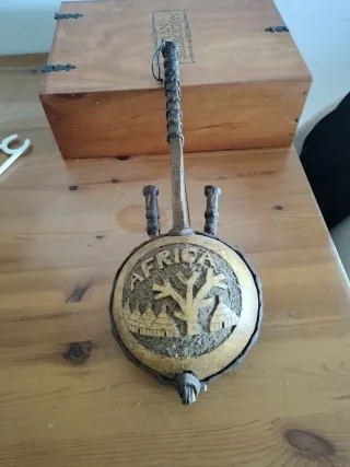 Instrumento musical africano tradicional, una kora. - Construcción en madera y cuero. - Diseño circular con mástil. - Cuerdas para tocar.