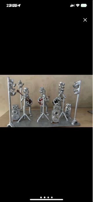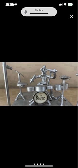 Preciosa escultura de The Beatles hecha con metal reciclado. Son dos figuras: una de la banda tocando y otra del bateria. - Fabricadas con materiales reciclados. - Diseño único y detallado. - Perfecto para coleccionistas o amantes de la música. Preciosas esculturas metálicas de The Beatles. Fabricadas con piezas metálicas, muestran a la banda en escena. - Incluye dos esculturas: una del baterista y otra del grupo completo. - Piezas únicas, ideales para coleccionistas. - En perfecto estado.