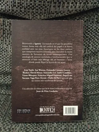 Textos de Lisa Tuttle, Francisco Miguel Espinosa, Fernando Cámara, Lauren Beukes, Yago Pena Alonso, Ángel Luis Sucasas, Pedro de Paz, Víctor Blázquez, David Mateo, Samantha Lee, Isabel Camblor e Ian Watson Palabras de agua