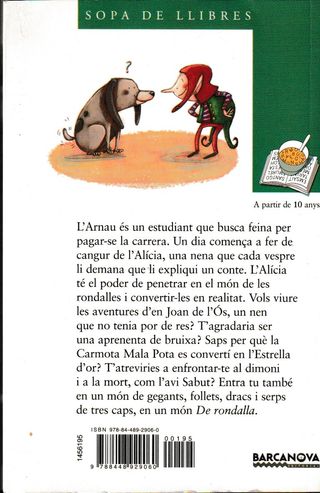 Ilustradora: Lucía Serrano. Editorial: Barcanova ISBN: 9788448929060 Idioma: Catalán, páginas: 208 L''Arnau és un estudiant que busca feina per pagar-se la carrera. Un dia comença a fer de cangur de l''Alícia, una nena especial que cada vespre li demana que li expliqui un conte. L''Alícia té el poder de penetrar en el món de les rondalles i convertir-les en realitat. Vols viure les aventures d''en Joan de l''Ós, un nen tan fort i llest que no tenia por de res? T'agradaria ser una aprenenta de bruixa durant la nit de Sant Joan? Saps per què la Carmota Mala Pota es convertí en l''Estrella d''or? T'atreviries a enfrontar-te ... W2atic