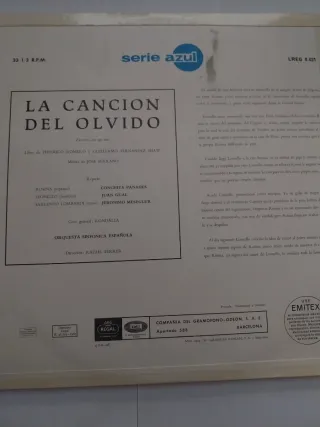 Disco de vinilo de la obra La Canción del Olvido de José Serrano. - Serie Azul. - Referencia: LREG 8.021.