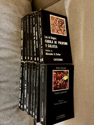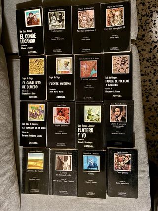 Colección clásicos historicos de la editorial Cátedra. Lote indivisible. 1. Don Juan Manuel – El conde Lucanor 2. Fernando de Rojas – La Celestina 3. Cervantes – Novelas ejemplares I 4. Cervantes – Nov. ejemplares II 5. Lope – El caballero de Olmedo 6. Lope – Fuenteovejuna 7. Calderón – La vida es sueño 8. Góngora – Fábula de Polifemo y Galatea 9. Vélez de Guevara – La serrana de la Vera 10. Juan Valera – Pepita Jiménez 11. Juan Ramón Jiménez – Platero y yo 12. J.R. Jiménez – Diario de un poeta recién casado 13. Antonio Machado – Campos de Castilla 14. Lorca – La casa de Bernarda Alba 15. Unamuno – Niebla 16. Neruda – Canto General