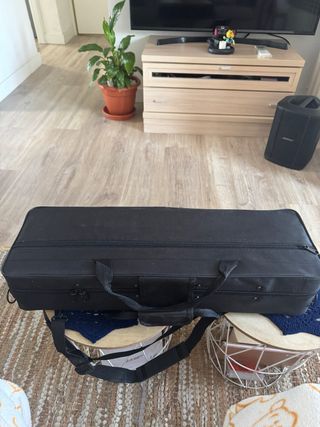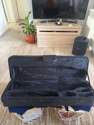 Funda acolchada para saxofón soprano. Es negra y tiene un diseño alargado. Nuevo, sin estrenar. - Medida aproximada: 58 cm. - Asa de transporte. - Bolsillo exterior con cremallera. - Cierre principal con cremallera. - Anilla metálica y correa para colgar.