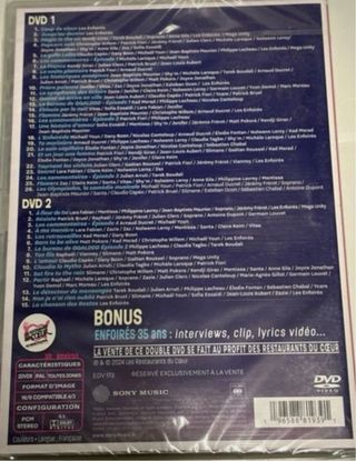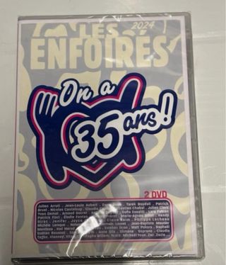 DVD del concierto Les Enfoirés 2024 - On a 35 ans!. - Incluye 2 DVDs. - Participan numerosos artistas como Julien Arruti, Patrick Bruel, Lara Fabian, Jenifer, Soprano y muchos más.