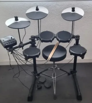 Set de batería aideal para iniciarse. La vendo por habérsele quedado pequeña a mi hijo. 4 pads de parches de malla ajustables 3 platos Pedales para charles y bombo Estructura metálica fácil de montar Modulo de la DM Lite con 10 kits y 120 sonidos Se conecta a ordenador o dispositivo para tocar a la vez con canciones preferidas Incluye sillín cableado y baquetas No incluye auriculares