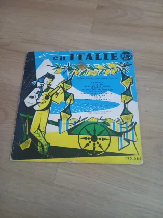 Disco de vinilo LP con melodías y canciones célebres de Italia. - Título: En Italie - Mélodies et Chansons Célébres - Canciones incluidas: La Danza, O Sole Mio, Arrivederci Roma, Serenata, Mandolino Mandolino, Santa Lucia, Una Gita a Le Castelli, Tarentella, Ideale, Torna a Surriento. - Artistas: Frankie Carle, The Three Suns. - Sello: RCA - Referencia: 130.059