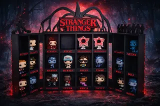 Expositor para figuras Funko Pop de Stranger Things, ideal para coleccionistas. Fabricado en impresión 3D con materiales de alta calidad. - Diseño inspirado en Stranger Things. - Espacio para 24 figuras. - Los nombre van sueltos y se pueden colocar a su gusto. - Acabado en color negro y rojo. - Se incluyen los soportes para las figuras que no se mantienen en pie. *Funkos no incluidos.
