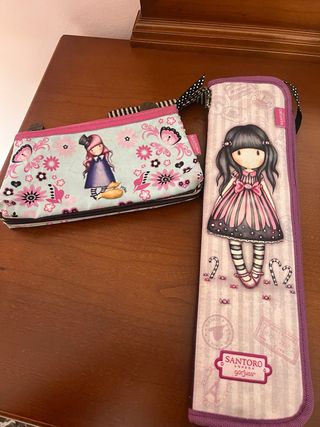 Conjunto de dos accesorios Santoro Gorjuss. - Estuche con diseño de niña y flores. - Funda alargada con diseño de niña y caramelos.