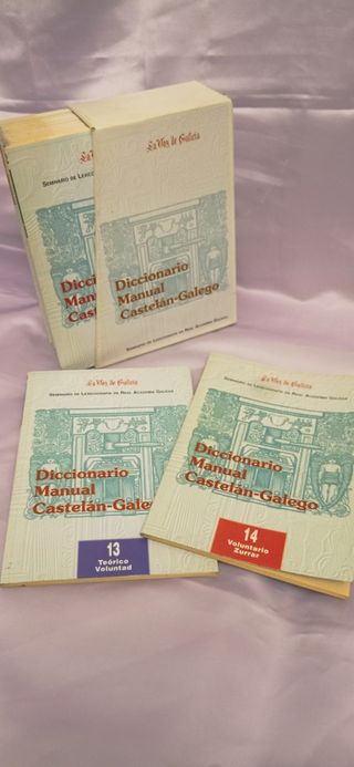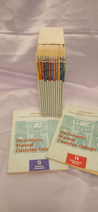Diccionario manual da lingua galega con sus correspondencias en castellano. Son 15 volúmenes, colección completa. Van en su caja organizadora para mantener todos los libros juntos. Edición basada en el Diccionario da Lingua Galega da Real Academia Galega e Instituto da Lingua Galega. Promoción de la Xunta en 1991 editado por la Voz de Galicia. En buen estado.