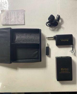 Micrófono inalámbrico Bolun WR-601, en excelente estado. - Incluye transmisor y receptor. - Micrófono de solapa. - Adaptador de audio. - Manual de instrucciones.