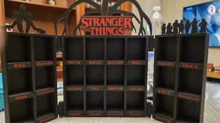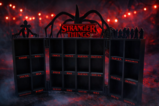 Expositor plegable temático de Stranger Things. Ideal para coleccionistas. - Diseño inspirado en la serie. - Compartimentos para figuras o artículos. - logo de Stranger Things. - Estructura negra.