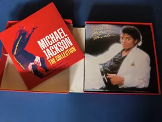 Colección definitiva de Michael Jackson, incluyendo el icónico álbum Thriller. - Portada Thriller con Michael Jackson. - Caja The Collection con diseño rojo.