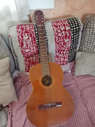 Guitarra española de la marca Estruch. Un instrumento clásico con un sonido cálido y resonante. Ideal para iniciarse. Le falta una cuerda. - Cuerpo de madera. - Mástil de madera. - Diapasón de madera.