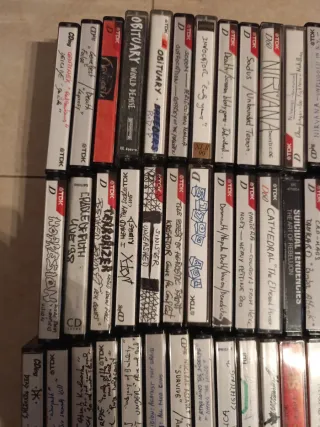 Más de 100 cassettes de la época ,en su gran mayoría grabadas de los CDs originales TDK Cding.....Hetsheads,Konkhrah,Obituary,Slayer,Sepultura,Napalm Death,Cradle of Filth ,Exploited ,Invocator,Intestine Baalism ,Metallica,Testament,Sinister,S.A,Beer Mosh,RDP....... NO SE VENDEN POR SEPARADO REGALO BOLSA MALETIN