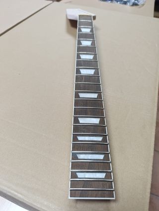 Mástil para guitarra eléctrica estilo Firebird, con pala inclinada e invertida (reversed). De arce con diapason de blackwood tek, sin acabado. Inlays de trapecios perlados Tiene los agujeros para los tornillos que lo unen al cuerpo y para los tornillos de las clavijas realizados. Si no encajan con los de las piezas con las que se vaya a montar sería necesario taparlos y realizar los que corresponda. Anchura al final del talón 55,5mm aproximadamente Longitud de escala: 628mm Es nuevo, no se ha montado. Tiene alguna pequeña reparación en el diapasón cerca de un inlay y algún poro abierto, pero nada importante. Se muestra en las fotos