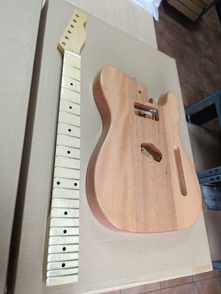 Conjunto de cuerpo y mástil para guitarra estilo Telecaster. El cuerpo es de madera de caoba acabado natural. El mástil de 22 trastes de arce, con diapasón de arce acabado clear gloss. El cuerpo tiene un par de manchas tenues en los laterales que se muestran en las fotografías. Pero no son notables como se puede ver. Por lo demás esta perfecto. El encaje es correcto también Si necesitas cualquier otro componente para el montaje puedes preguntarme