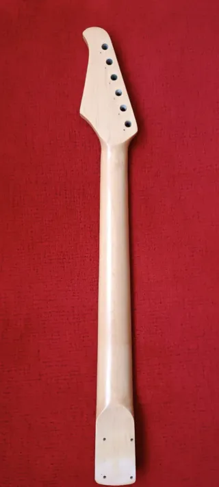 Mástil escalopado para guitarra estilo Telecaster fabricado en arce acabado vintage tint gloss. Es nuevo, sin usar. Tiene un pequeño defecto de acabado que se muestra en la última fotografía Anchura al final del talón 57,3mm aproximadamente