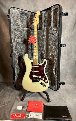 Stratocaster American Elite fabricada en USA (2017). Guitarra de gama alta, súper cómoda y versátil. Estado impecable. Ni una marca. Pastillas Ultra Noiseless (sonido Strat clásico sin ruidos), mástil moderno con radio compuesto para máxima comodidad y S-1 switch, que amplía las combinaciones de sonido mucho más allá de una Strat standard. Hardware premium con trémolo 2 puntos, clavijas con bloqueo y excelente estabilidad de afinación. Incluye estuche rígido Fender premium y toda su documentación.