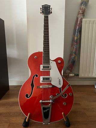 Guitarra eléctrica Gretsch G5420T Electromatic OS con acabado en rojo. - Cuerpo hueco con acabado brillante. - Mástil de arce. - Pastillas FT-5E Filter'Tron. - Puente Adjusto-Matic con Bigsby B50 Vibrato. Está impecable, sin apenas uso.
