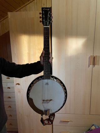 Banjo de la marca Airang. Instrumento musical con un diseño clásico. - Cuerpo redondo con aro metálico. - Mástil de madera con diapasón. - Incluye correa decorada. - Un poco de óxido en algunos trastes