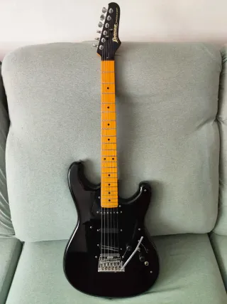 Made in Japan de 1985. Se sustituyeron la pastilla del mástil por una Fender tex-mex y la del puente por una hotrail Seymour Duncan, intercambiando con el interruptor entre conexión en serie o paralelo, consiguiendo el sonido típico humbucker o P90 en lugar de single. Se entregarán también las pastillas originales. Trastes en buen estado y acción baja. A reseñar una grieta en la pintura por presionar contra el cuerpo demasiado el puente para bloquearlo el anterior dueño y un pequeño golpe en el cuerpo. Ahora está ajustado como puente flotante.