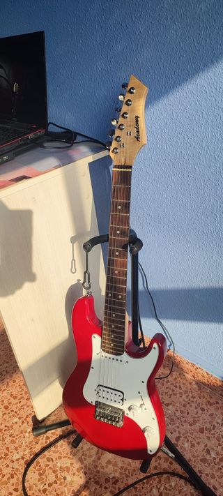 Guitarra eléctrica para niños, en color negro, marca Harley Benton. Incluye correa, funda y amplificador. Tiene un golpe reparado que no afecta a nada. Son 87 cm de punta a punta y 44 cm la parte marrón del mástil.