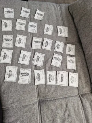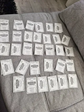 Colección de cromos de la serie Stranger Things. Repetidos:helfire H8,H9,H12. 4,6,20,22,29,32,34,36,39,47,49,50,51,52,53,54,56,57,62,64,72,74,80,82,84,95,96,99,102,107,113,,117,118,121,129,134,135,148,151,157,158,159,166,168 - Varios números disponibles.0,20céntimos cada cromo