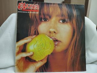 Disco de vinilo LP del grupo Saxon, titulado Innocence Is No Excuse.
