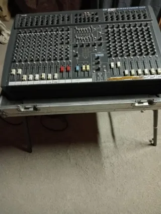 Vendo mesa de mezclas profesional Soundcraft Spirit Powerstation 1200 operativa. Características principales: Potencia: Amplificador integrado de 2 x 600W a 4 Ohmios. Canales: 16 entradas mono (micro/línea) con previos UltraMic de alta calidad y 2 canales estéreo. Efectos: Procesador de efectos digital Lexicon integrado (reverbs y ecos profesionales para voces). Ecualización: Ecualizador gráfico de 7 bandas para la mezcla principal y EQ de 3 bandas por canal. Estado: Plenamente operativa. Ha pertenecido a un solo dueño. Preferible trato en mano por el peso del equipo.