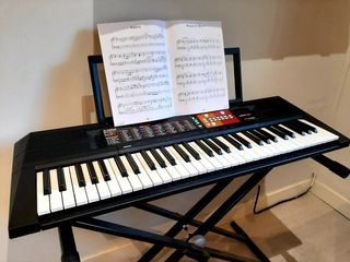 Roland GO:Piano de 61 teclas, con simulación de 128 sonidos distintos, metrónomo, transposición, efectos… Tiene altavoces, bluetooth, salida de auriculares y entradas de pedal, USB (para usar como teclado MIDI) y auxiliar. Puede funcionar a pilas. Incluyo atril y fuente de alimentación (ver foto).