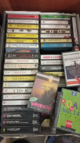 Colección de cintas de cassette con una variedad de géneros musicales. Ideal para coleccionistas y amantes de la música. - Incluye títulos de artistas como Julio Iglesias, ABBA, Richard Wagner, Giuseppe Verdi, y más. - Diversos géneros: pop, rock, clásica, ópera y recopilatorios. - Algunas cintas presentan etiquetas con títulos y artistas visibles. Precio a convenir