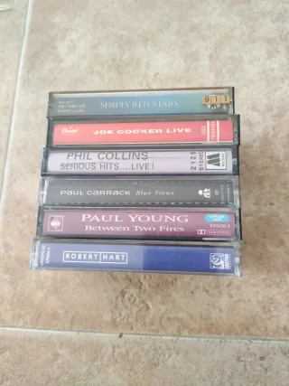 Conjunto de seis cassettes de música. - Phil Collins: Serious Tour 1990 - Joe Cocker: Live - Simply Red: Stars - Robert Hart: Robert Hart - Paul Young: Between Two Fires - Paul Carrack: Blue Views