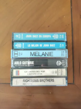 Conjunto de seis cassettes de música. - Lo mejor de Joan Baez - Joan Baez en Europa - Melanie: From the Beginning - Cat Stevens: Gigantes del Pop - The Best of Arlo Guthrie - Reunion de Righteous Brothers