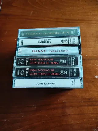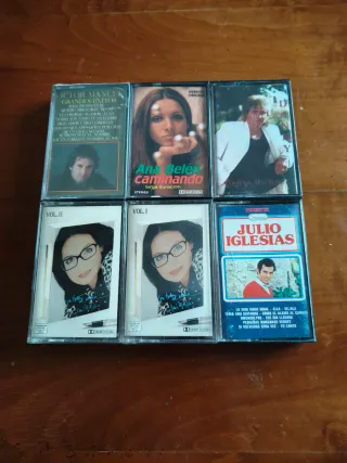 Conjunto de 6 cassettes de música variada. Precio por todo el lote - Incluye Grandes Éxitos de Víctor Manuel. - Caminando de Ana Belén. - Quiero Decirte de Julio Iglesias. - Vol. II y Vol. I de Nana Mouskouri - Continental de Julio Iglesias.