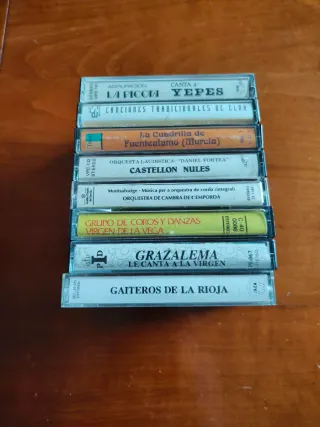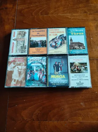 Colección de 8 cintas de casete con música regional de España. Precio por unidad - La Cuadrilla de Fuentealamo - Folklore de la Región Murciana - Canciones Tradicionales de Elda - Agrupación La Picota canta a Yepes - Gaiteros de la Rioja - El Colegio Grazalema le canta a la Virgen (Misa Rociera) - Murcia Grupo de Coros y Danzas Virgen de la Vega - Montsalvatge Música per a orquestra de corda - Voces del Pueblo Toledo