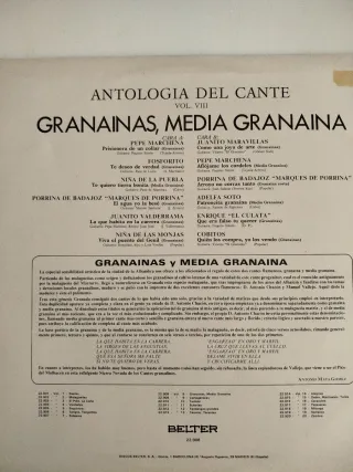 Disco de vinilo LP Antología del Cante Granainas, Media Granaina. - Incluye temas de Pepe Marchena, Niña de la Puebla, Juanito Maravillas, Porrina de Badajoz, Juanito Valderrama, Niña de las Monjas, Enrique El Culata, Adelfa Soto, Fosforito y Cobitos. - Sello discográfico BELTER. - Referencia 22.908.