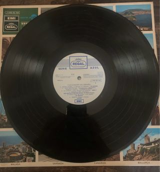 Disco de vinilo recopilatorio 'Vacaciones en España' de Regal Serie Azul. - Incluye temas de Asturias, Bilbao, San Sebastián, Santiago de Compostela, Madrid, Sevilla, Málaga, Granada, Canarias, Valencia, Zaragoza, y Barcelona. - Formato LP.