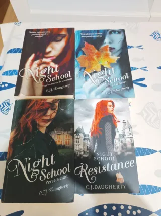 Cuatro de los cinco libros de la saga Night School Los tres primeros están en español, el cuarto en inglés Son libros muy viejos, amarilleados por el paso del tiempo y gastados, de ahí que se vendan baratos No separo