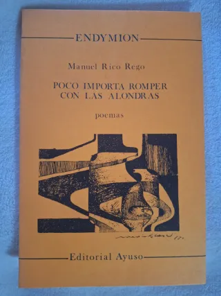 Libro "Poco importa romper con las alondras" de Manuel Rico Rego. Editorial Ayuso, Endymion (13). Tercera edición: 1980. Tapas blandas. 74 páginas.
