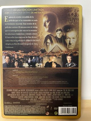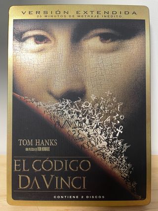 Edición metálica tipo Steelbook de la película El código Da Vinci, protagonizada por Tom Hanks y dirigida por Ron Howard. Incluye la versión extendida con 25 minutos de metraje inédito y 2 discos con abundante material adicional. Contenido:• Disco 1: Película versión extendida• Disco 2: Extras y reportajes detrás de las cámaras• Catálogo de reproducciones oficiales• Caja metálica Steelbook original Estado:Muy buen estado. Discos y caja cuidados. Ideal para coleccionistas de ediciones metálicas / Steelbook o fans de la saga basada en la novela de Dan Brown. 📀 Edición descatalogada. Precio: 15 €
