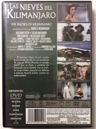Película DVD EDICIÓN ESPECIAL PARA COLECCIONISTAS Cine Aventuras, África, Guerra Civil Española, Años 30 ¡MILES DE TODOS LOS GÉNEROS! ¡UTILIZA EL HASHTAG #cinemaniático! PREGUNTA SIN NINGÚN COMPROMISO Sinopsis: Con una herida en una pierna que amenaza gangrena, el novelista Harry Street y su esposa Helen se encuentran perdidos en el continente africano y tienen pocas esperanzas de sobrevivir... Dirección: Henry King Reparto: Gregory Peck Ava Gardner Susan Hayward Hildegard Knef Marcel Dalio The Snows of Kilimanjaro Guion: Casey Robinson, Ernest Hemingway (Novela) Música: Bernard Herrmann Fotografía: Leon Shamroy