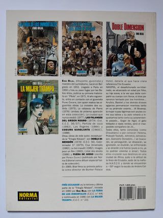 Autor: Enki Bilal Norma (Col. Cimoc Extra Color no 100) 1a edición: 1993 (Descatalogado) FRÍO ECUADOR fue declarado libro del año en Francia en 1992. Alcide Nikopol viaja por el mundo como deportista de élite, siempre acompañado por el altivo y cruel Horus. Mientras, su hijo Niko le sigue la pista. Fantástica y apasionante historia ambientada en un mundo futuro en que los dioses egipcios, vanidosos, intrigantes y crueles, se mezclan con los hombres. CONDICIONES: ➡️Posibilidad de descuento por volumen de compra ➡️PAGO POR BIZUM o PAYPAL. HAGO ENVÍOS por InPost. (No por Wallapop). Gastos de envío: 5€. También entrega en mano..
