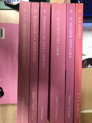 6 titulos de La sonrisa vertical Sor Mónica El pecador impecable El habito del amor Memorias de Dolly Morton Eligio de la madrastra Un librero pornográfico