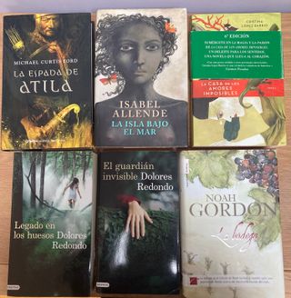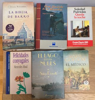 3 novelas a elegir entre las siguientes: - El lago de las nubes, de Sara Donati. Editorial Salamandra. - El médico, de Noah Gordon. Ed. Rocabolsillo. Tapa blanda. - Me hallará la muerte, de Juan Manuel de Prada. Ed. Destino. Tapa blanda. - La bodega, de Noah Gordon. Ed. Roca. - Don Quijote de la Mancha, de Miguel de Cervantes. Ed. Espasa Calpe. - La biblia de barro, de Julia Navarro. Ed. Plaza-Janes. - Queda la noche, de Soledad Puertolas. Ed. Planeta. - La espada de Atila, de michael Curtis Ford. Ed. Grijalbo. - La casa de los amores imposibles, de Cristina López Barrio. Ed. Plaza-Janes. Tapa blanda. - Y otras... (ver imagenes)