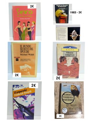 Libros a 2€ cada uno. Avenida del parque 79, La vida de Miguel de Cervantes Saavedra, entre el aviador y el millonario, primer concurso cuentos Bilbao 1980, S en Nueva York, folleto diamantes ron, fábulas Esopo, el mundo secreto del Opus Dei, león invisible, emperador, Anaconda, Galápagos, Manaos, Panamá, Marea negra, quién mató embajador, Tuareg, la iguana, Tierra virgen, 1808: aventura en Zaragoza. Mando fotos e información detallada