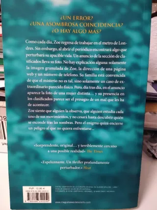 Argumento: Zoe Walker, una madre trabajadora que usa el metro de Londres, encuentra su foto en la sección de clasificados de un periódico (findtheone.com) junto a un número de teléfono. Aunque su familia cree que es un parecido físico, ella descubre que otras mujeres han aparecido ahí y luego han sufrido agresiones, convirtiendo la situación en una carrera contra el tiempo. Zoe siente que alguien estudia cada uno de sus movimientos, creando un suspenso constante hasta descubrir quién se esconde detrás. Es una novela policiaca de suspense, elogiada por ser muy adictiva!