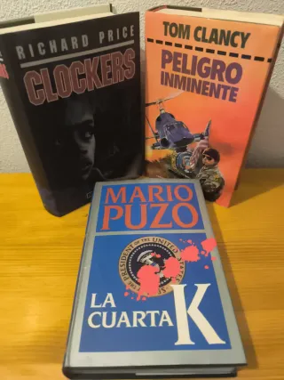 Vendo lote de tres libros de novela negra, intriga, misterio, thriller... todos en tapa dura y en buen estado, a 3€ la unidad: - Peligro Inminente (Tom Clancy) - La Cuarta K (Mario Puzo) - Clockers (Richard Price)
