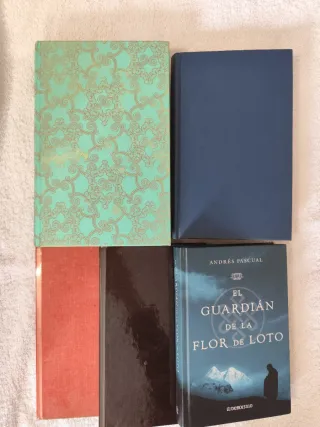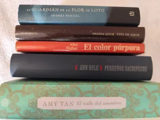 Vendo lote de 5 libros de tapa dura, todos en buen estado, de autores reconocidos y de temática variada: romance, narrativa contemporánea y novela histórica. • El guardián de la flor de loto — Andrés Pascual • Cita de amor — Amanda Quick • El color púrpura — Alice Walker • Pequeños sacrificios — Ann Rule • El valle del asombre — Amy Tan Precio individual: 5€ Precio del lote: 20€