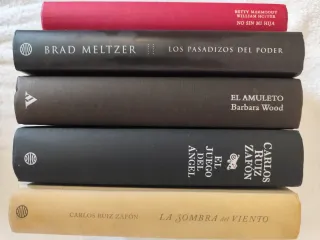 Vendo lote de 5 libros de tapa dura, todos en buen estado, de autores reconocidos y de temática variada: novela histórica, thriller, misterio y narrativa contemporánea. • No sin mi hija — Betty Mahmoody y William Hoffer • Los pasadizos del poder — Brad Meltzer • El amuleto — Barbara Wood • El juego del ángel — Carlos Ruiz Zafón • La sombra del viento — Carlos Ruiz Zafón Precio individual: 5€ Precio lote: 20€
